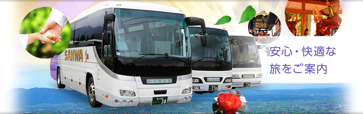 三和交通株式会社は、南砺市に拠点を置き観光旅行から各種行事、冠婚葬祭の送迎まで、 地域の皆さんの日常生活に必要不可欠な公共交通として貸切バス・介護タクシー事業を行なっております。 多様な車種を取り揃え「安全・親切・快適」をモットーに、 お客様本位のサービスをお届けいたします。